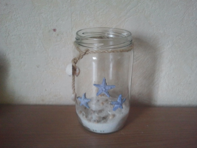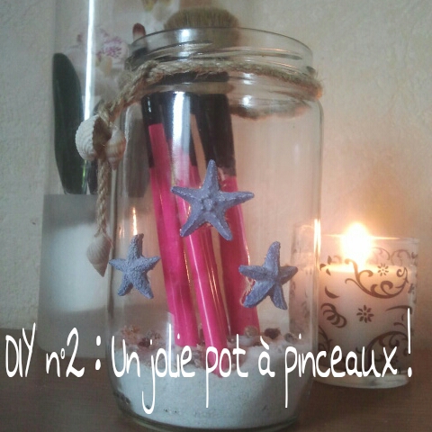 Pour ça, il vous faudra un pot en verre (moi c’est un pot contenant des haricots verts ;p de la glue, vos pinceaux, du sable et des coquillages !