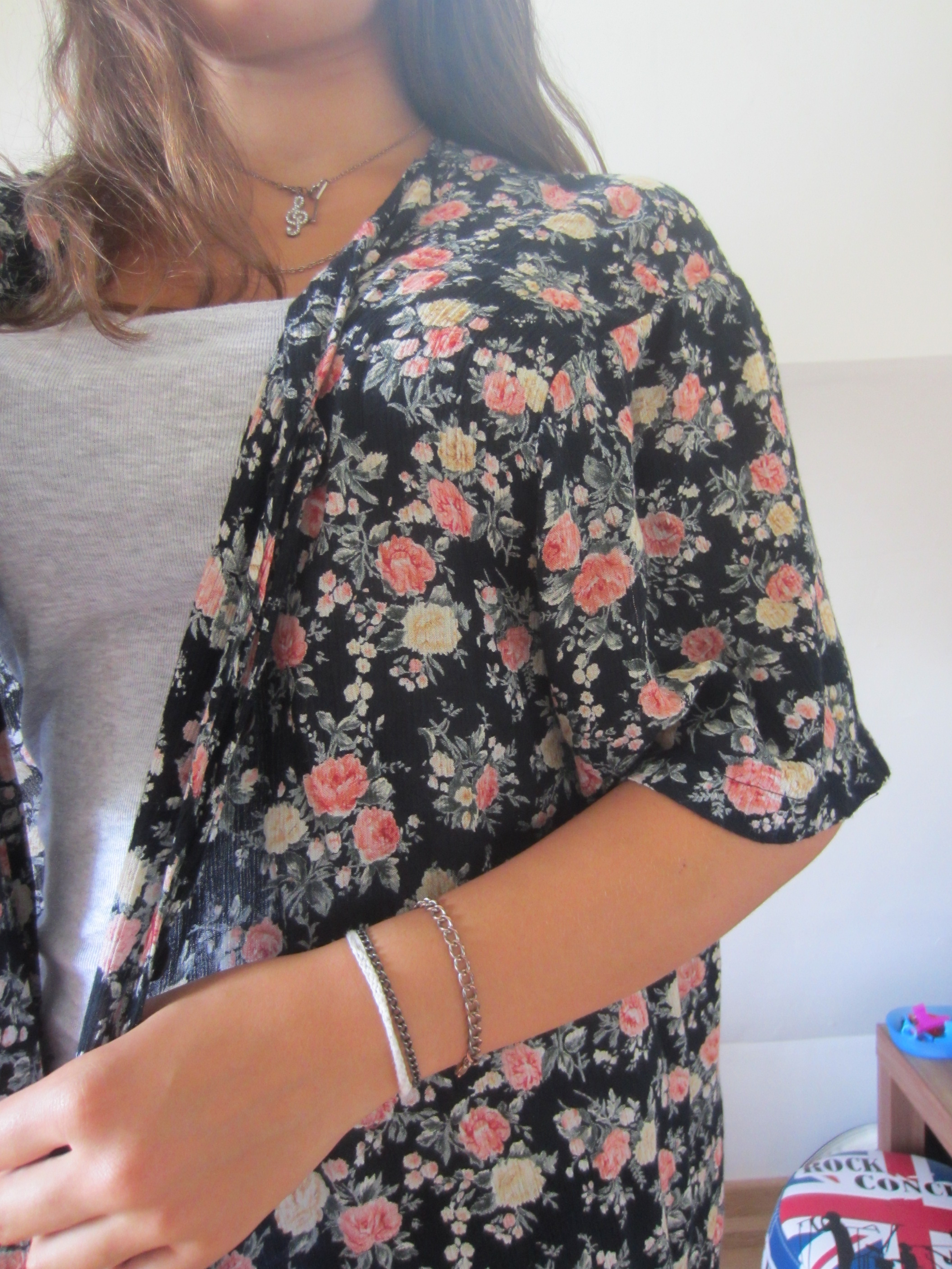 Alors j’opte plutôt pour un débardeur long avec un kimono à fleur et un short, au dessus des collants fin !