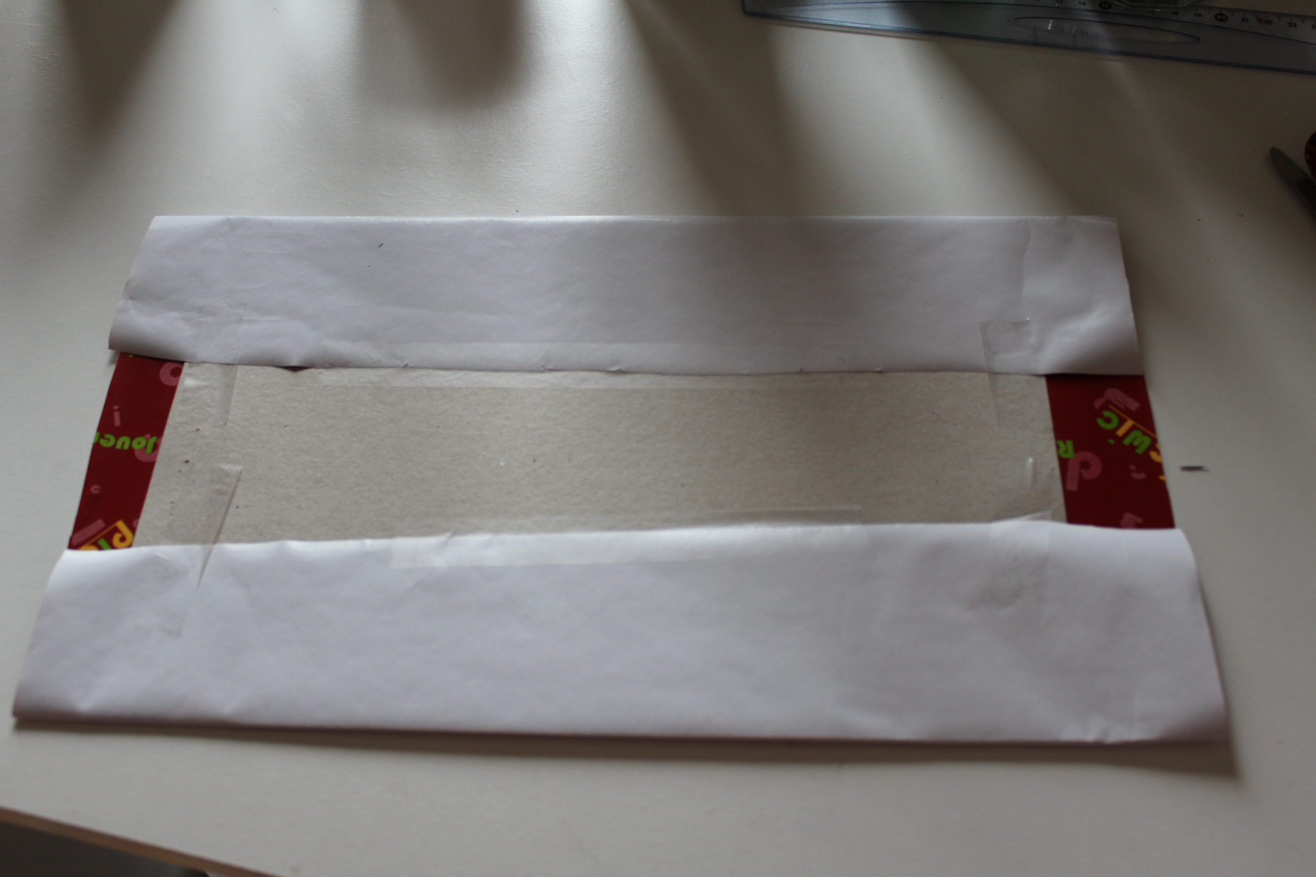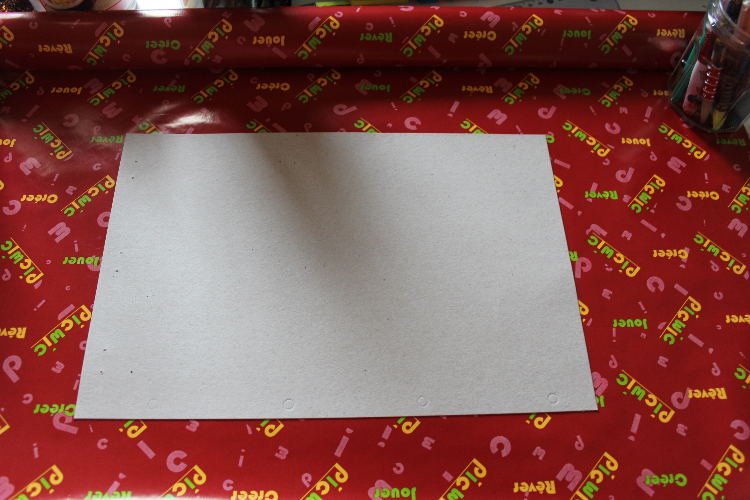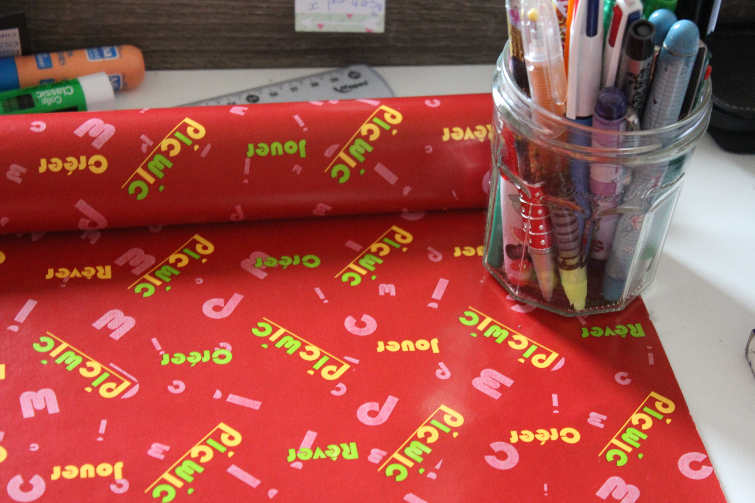 Je viens ensuite poser le papier cadeau que je tiens tendu grâce à quatre pots à crayon)