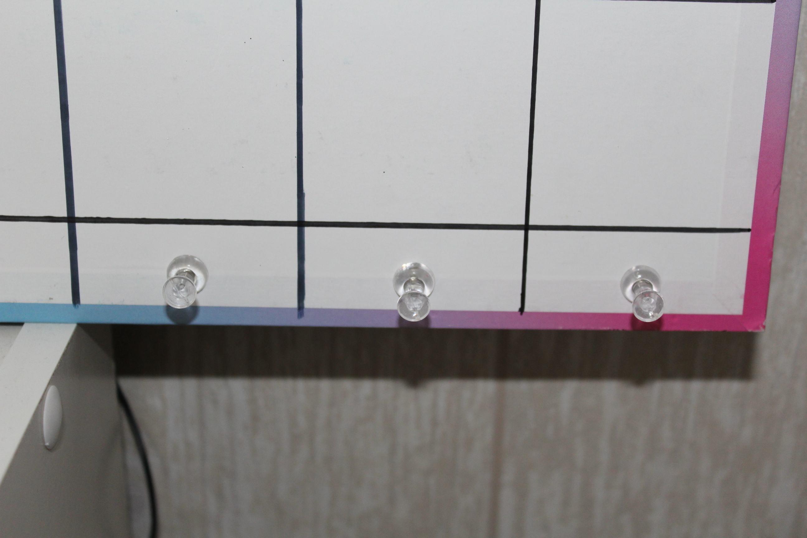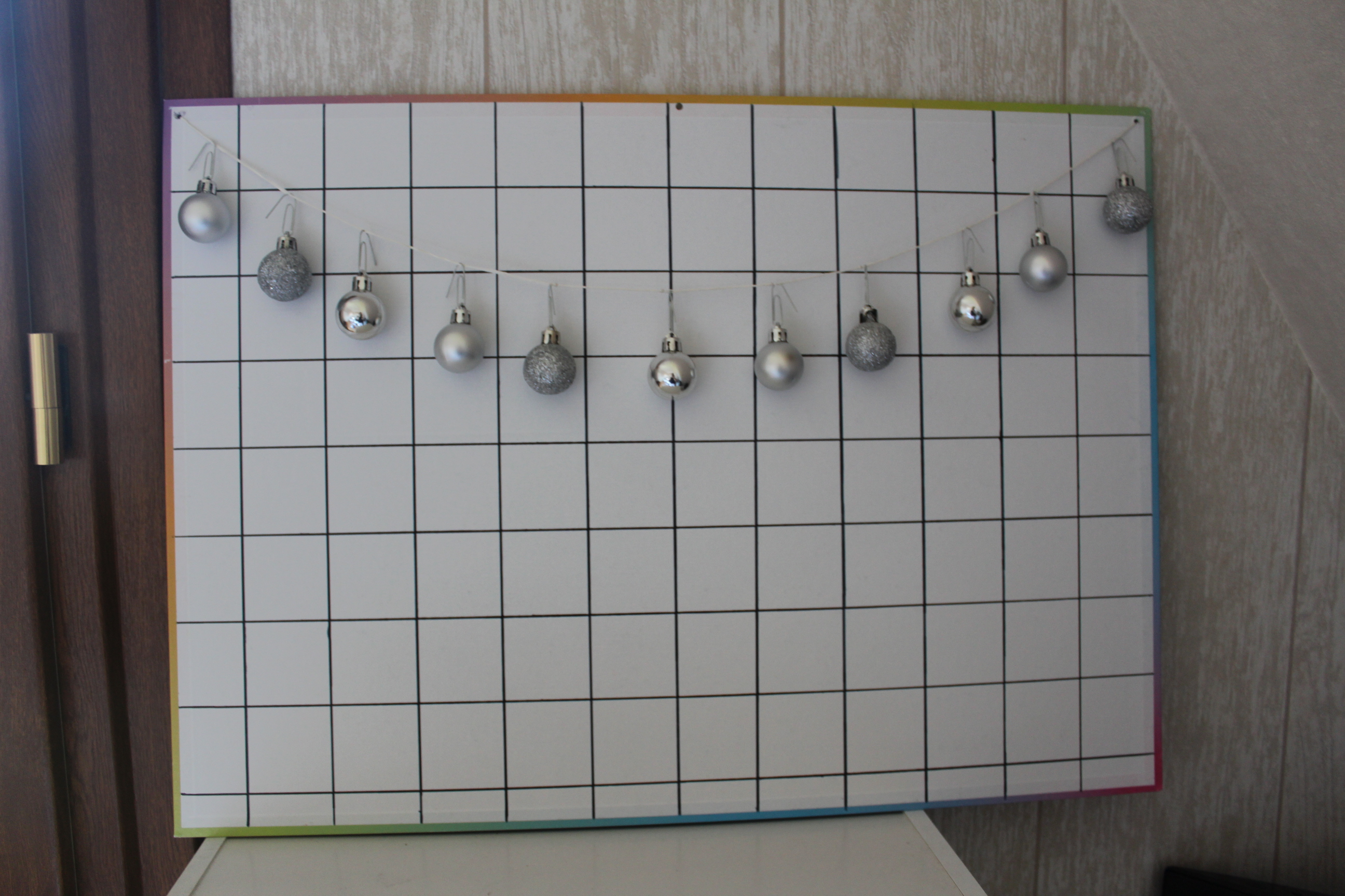 Il vous faudra comme matériel trois punaise transparente, une guirlande (celle ci c’est moi qui l’ai faite) un support, un règle de 50 cm, un crayon et un marqueur !