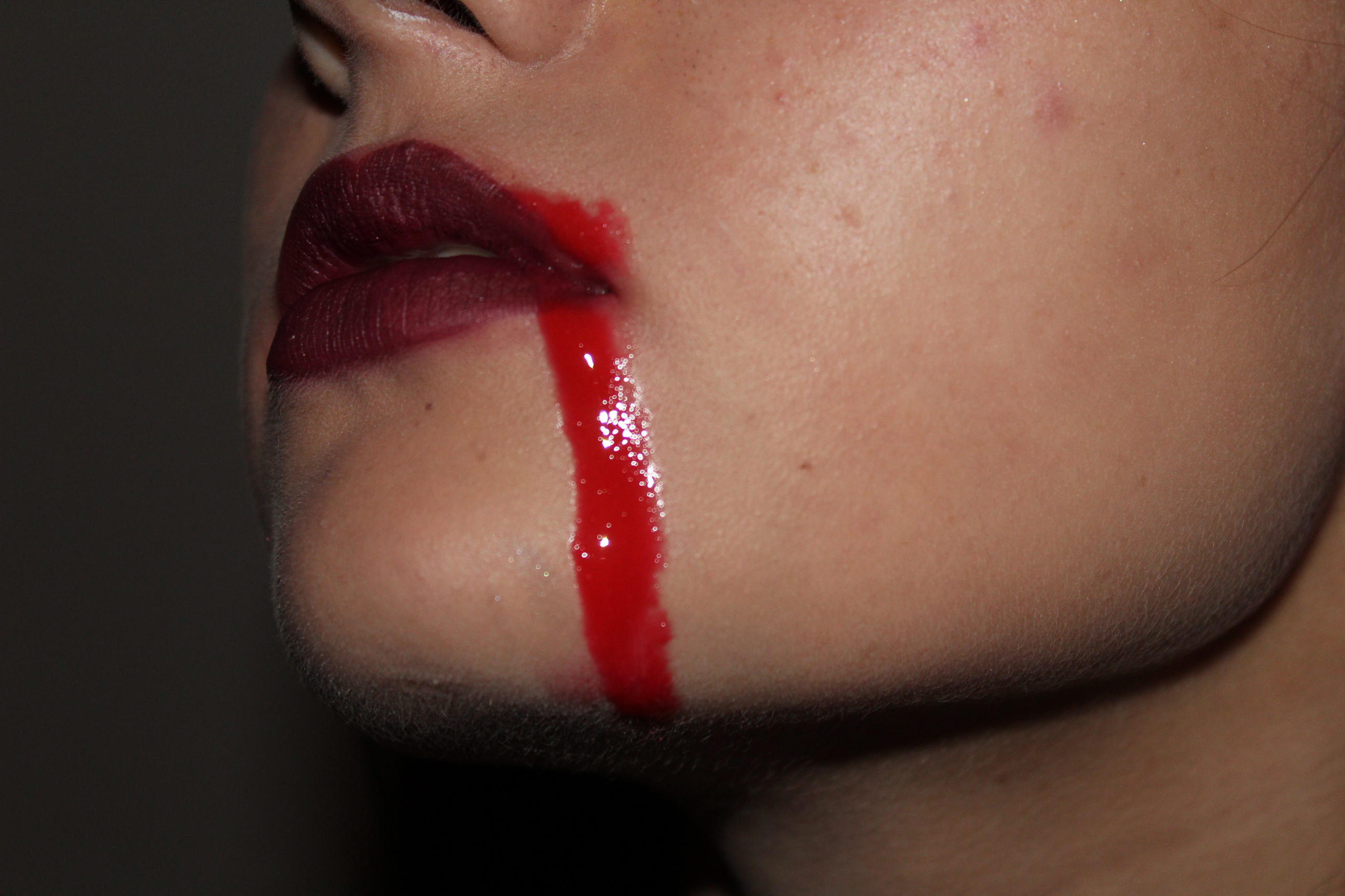 Pour la bouche j’ai mis un rouge à lèvre foncé, que j’ai poudré pour plus de tenue et avec un gloss rouge (ou du faux sang, mais moi je n’en avait pas) vous faite une trace comme si vous aviez manger quelqu’un