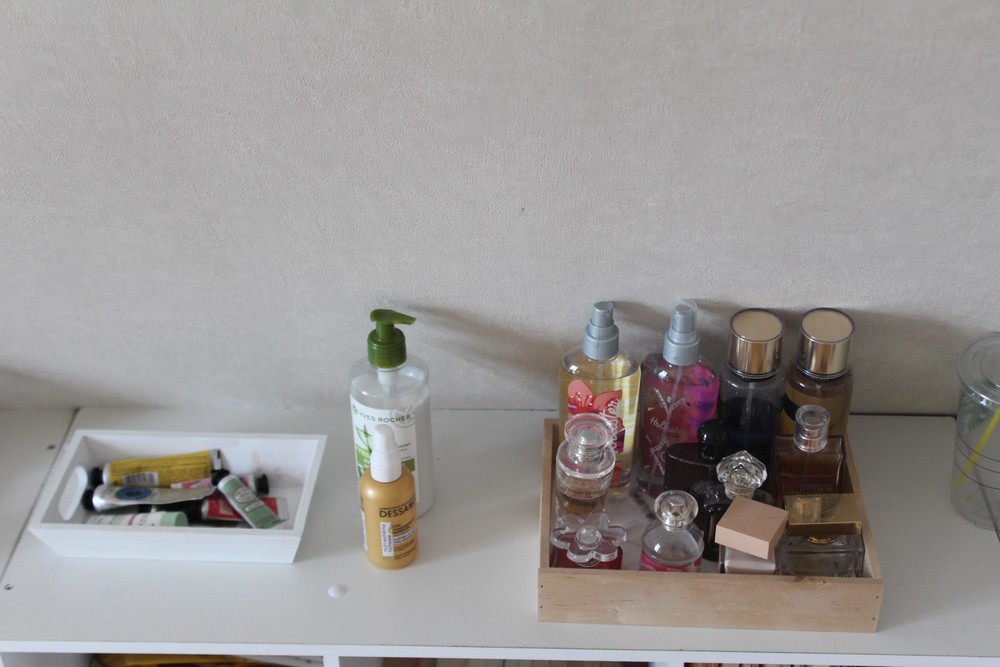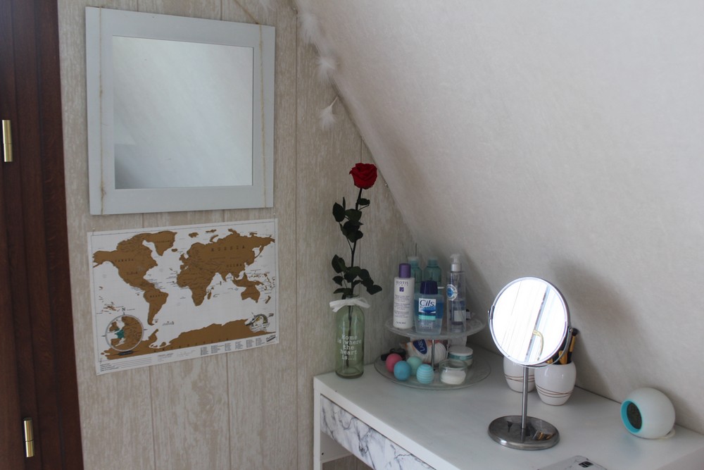 Le plus souvent je me maquille debout mais quand je fais un maquillage plus complexe, j’ai besoin de place et d’être assise 😉