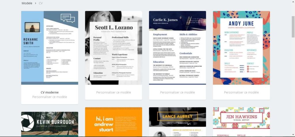 De plus, je vous propose le site « Canva« . Ce site vous propose plusieurs modèlestout prêt que vous n’avez plus qu’à replier. Bien sûr le mieux est de le faire soit même mais parfois ce genre de coup de pouce peut s’avérer très utile. Il n’est pas spécialisé que pour le CV, mais bon vu que c’est quand même le cœur de cet article, je vous invite à aller voir directement sur le site tout ce qui peut être fait.