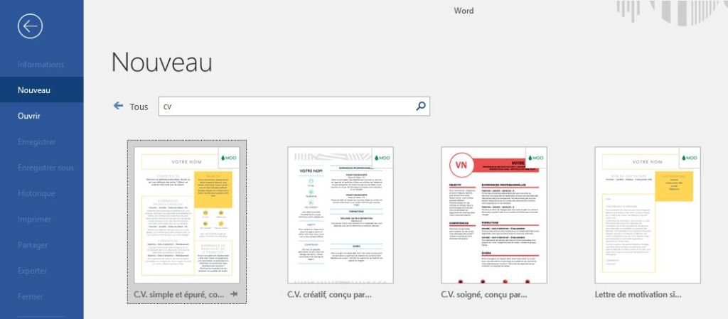 Parce que oui, aujourd’hui même si on ne s’y connait pas en matière de logiciel, Word propose des CV pré remplis à ajuster comme vous le souhaiter.