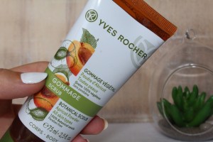 Je commence par gommer mes bras et mes jambes avec le gommage à l’abricot Yves Rocher