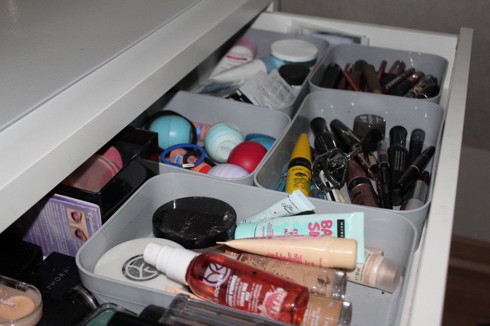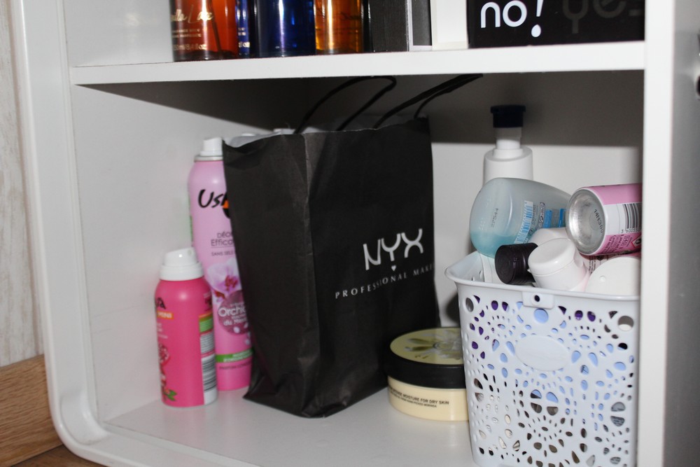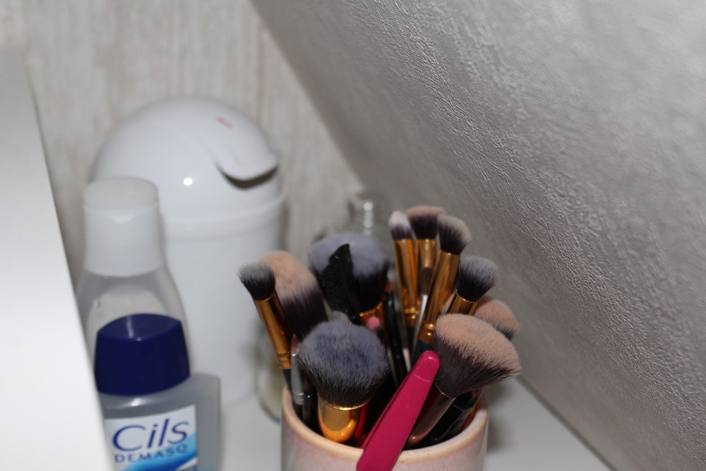 Sur le dessus de ce caisson, on retrouve mes pinceaux, ma poubelle et mes démaquillants