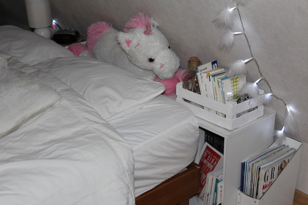 Ma licorne était tellement grande qu’elle ne passait nulle part. J’ai l’ai donc mis derrière mon lit à coté de mon réveil et de ma lampe.