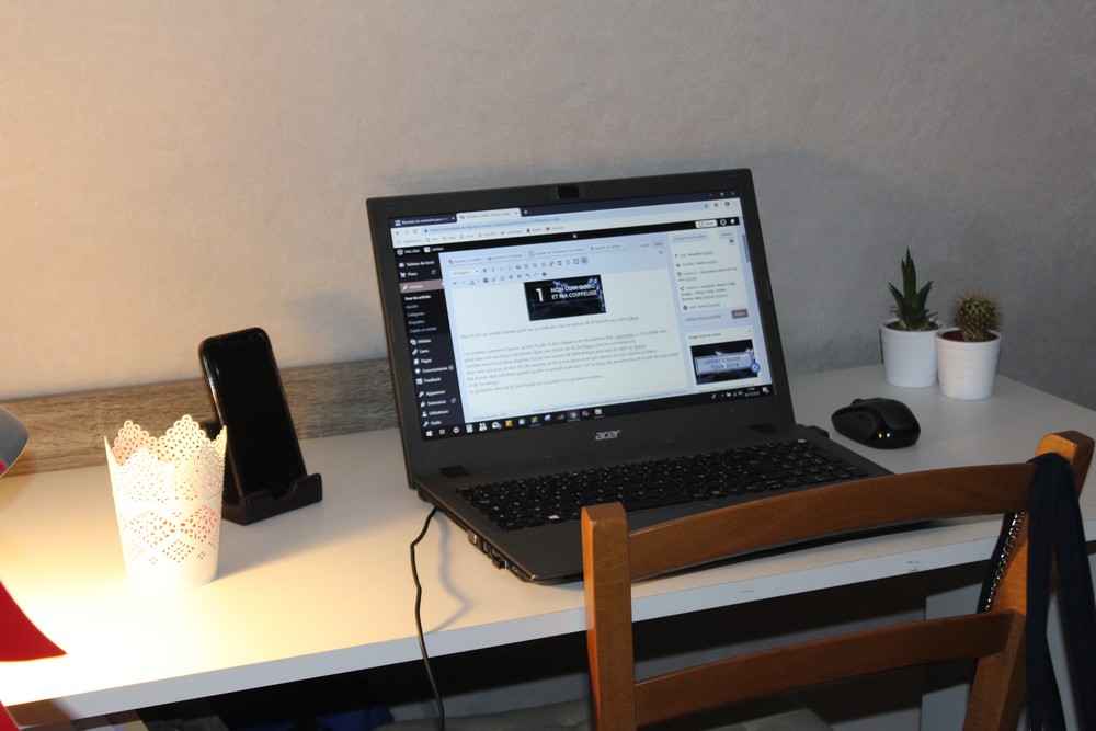 Enfin mon bureau. Comme je vous l’ai dis, je n’ai plus qu’un ordinateur du coup il est vraiment minimaliste. Deux cactus d’Ikea, les magazine 2019 (que j’ai eu en stage), un pot à crayon et une bougie. Sans oublier mon énorme calendrier !