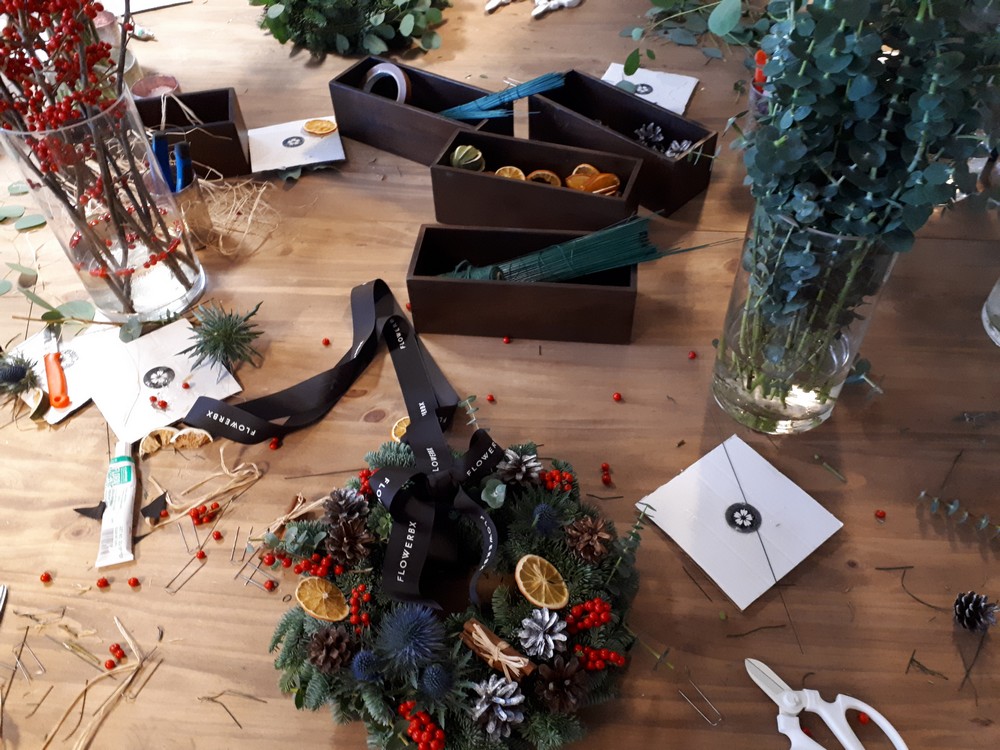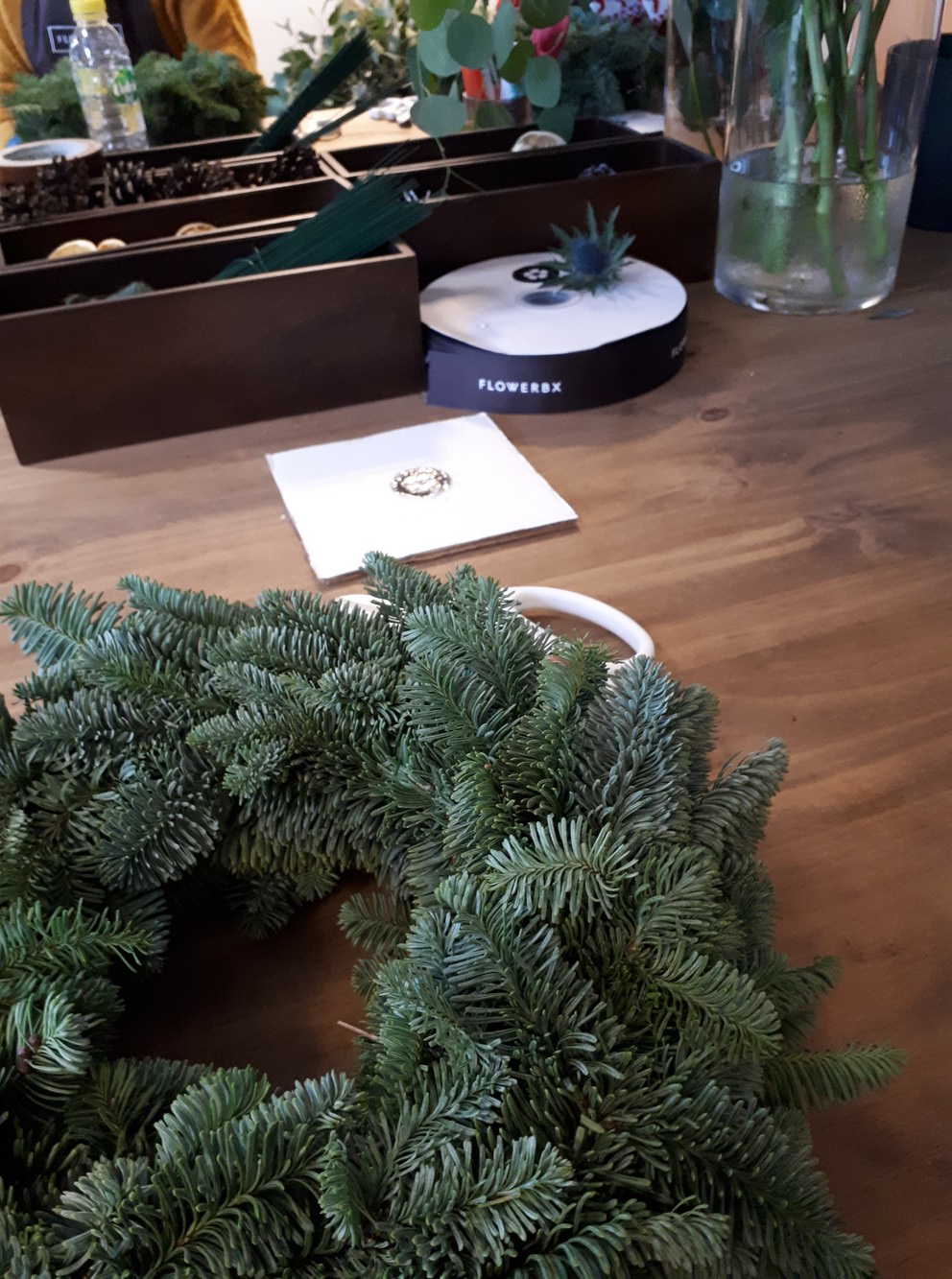 A l’aide de deux fleuristes, j’ai pu crĂ©er ma couronne de NoĂ«l. Dans un premier temps, elles nous ont distribuĂ© une couronne vierge et nous ont prĂ©sentĂ© les diffĂ©rents composants possibles. Entre les pommes de pin, la cannelle, l’orange sĂ©chĂ©e ou encore les chardons, il y avait du choix. Tous venait de leur atelier situĂ© Ă  Paris.