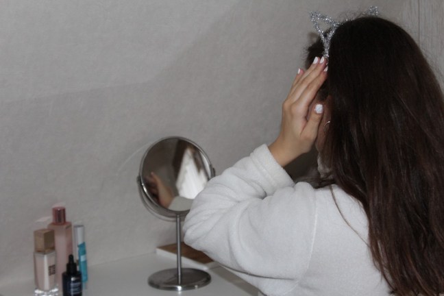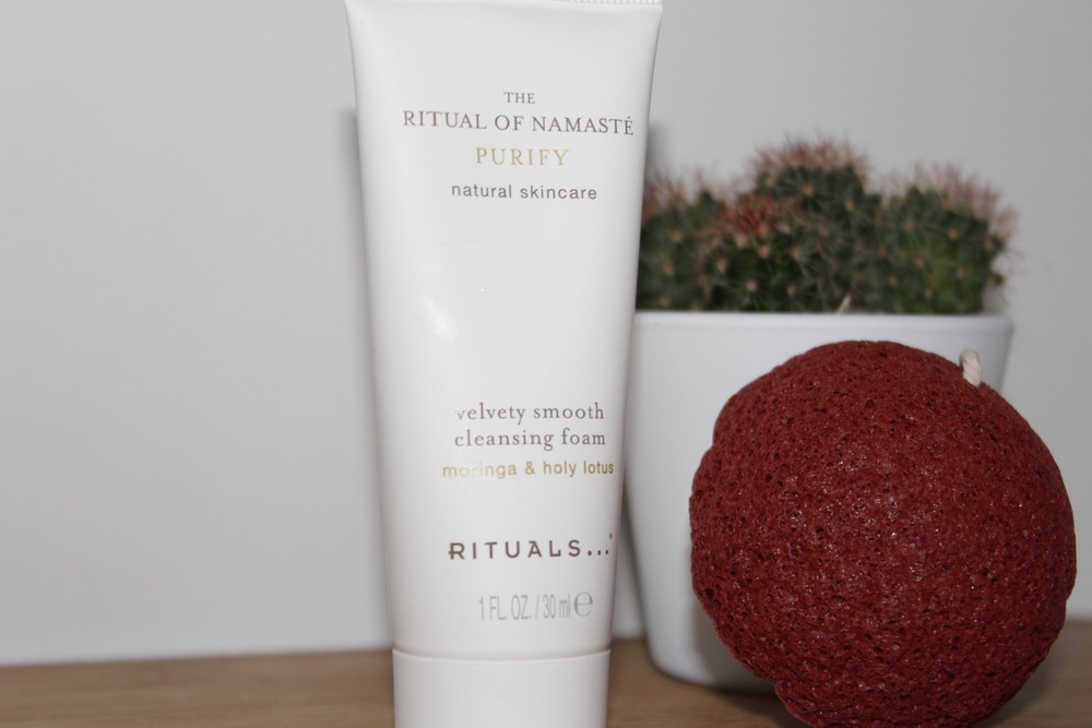 Je commence par me nettoyer le visage à l’aide d’une éponge et d’une mousse purifiante de chez Rituals.