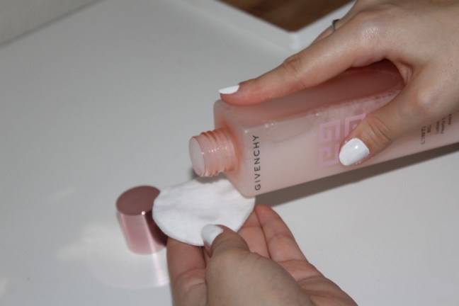 Je continu avec la lotion éclat Rosé anti-fatigue de chez Givenchy. Je l’applique sur la totalité de mon visage à l’aide d’un coton.