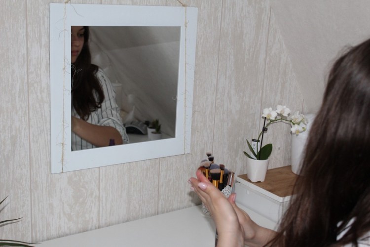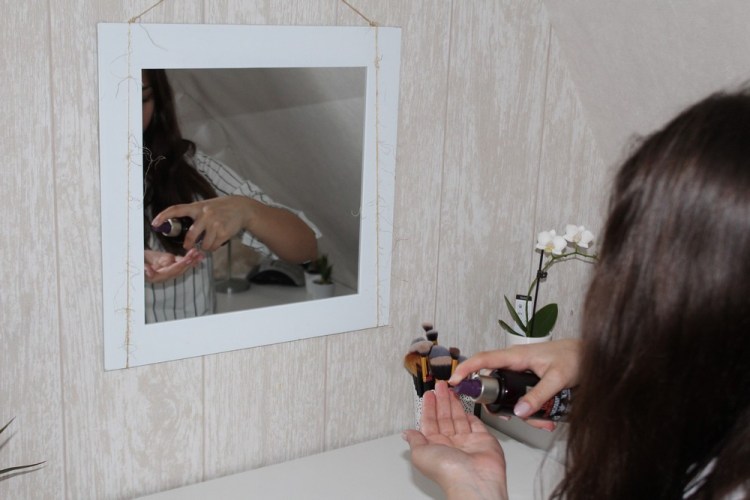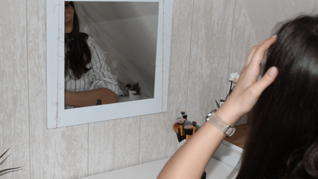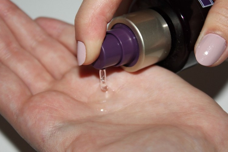 Je sépare mes cheveux en deux. Par la suite, je prends 3 gouttes pour chaque côté de la tête. Je réchauffe le produit en frottant mes mains l’un contre l’autre puis et j’applique de haut en bas.