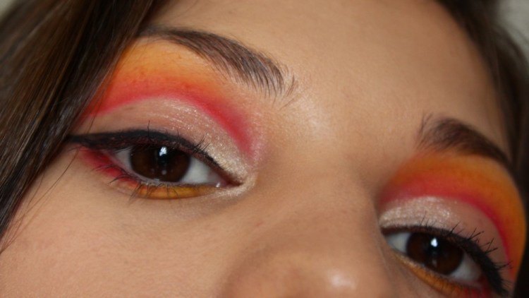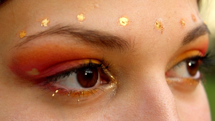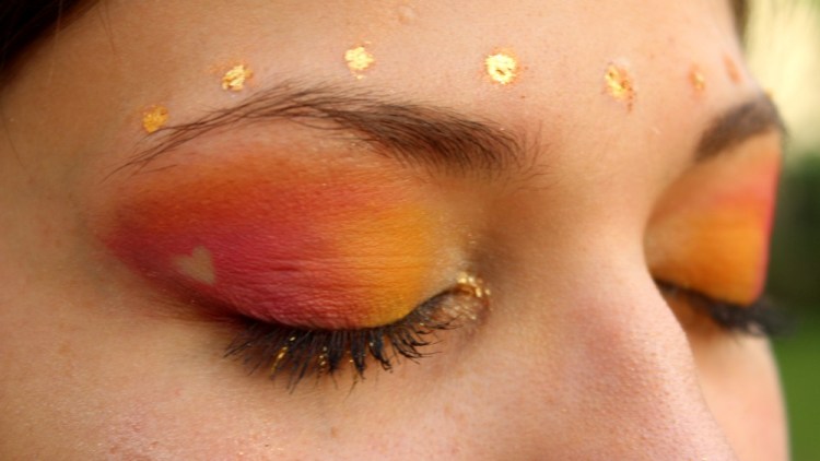 Pour celui-ci j’ai décidé d’utiliser l’ombre à paupières rose en coin externe accompagnée d’un petit cœur et l’ombre jaune en coin interne. N’oubliez pas de bien estomper pour que les deux fards se mélangent et donnent de l’orange. Sur ce maquillage, j’ai également le dessous du sourcil et le dessous de l’œil. Je mets la dernière ombre à paupière la plus claire en coin interne et du mascara couleur or.
