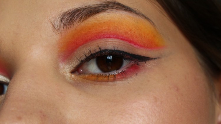 Pour ce deuxième maquillage, j’ai choisi de mettre d’abord du rose sur toute ma paupière mobile. J’ai ajouté du jaune au ras du sourcil puis j’ai estompé et mélangé les fards. Je fais pareil pour le ras de cil inférieur. Je trace ma ligne et quand tout est parfait, je fais mon trait d’eye-liner